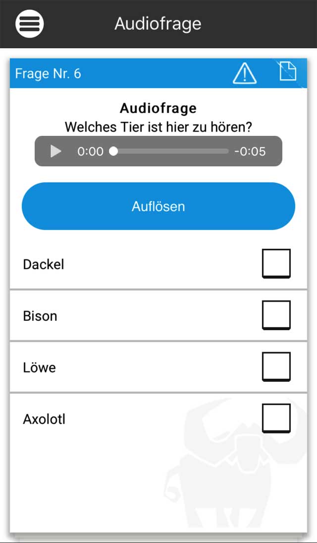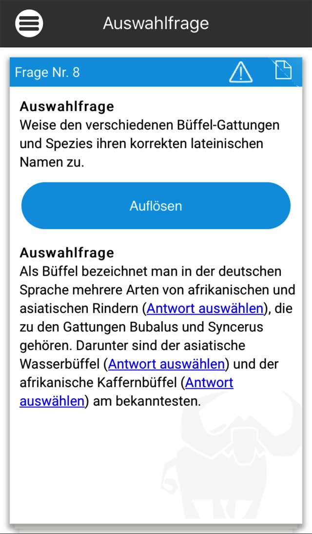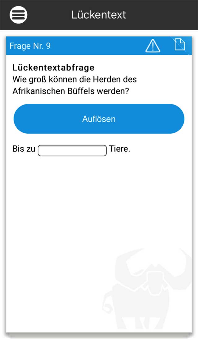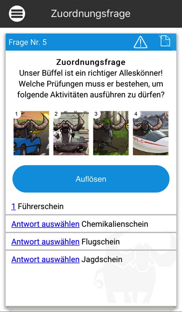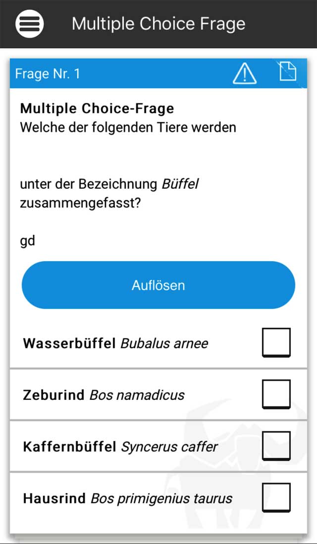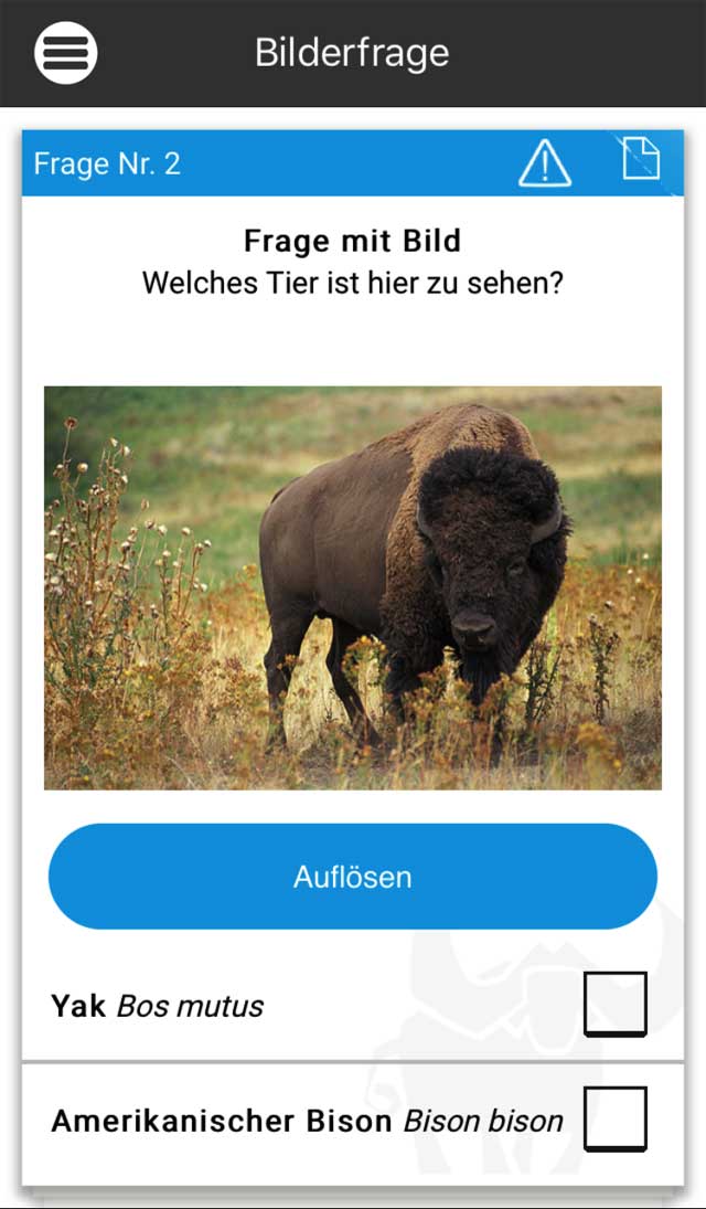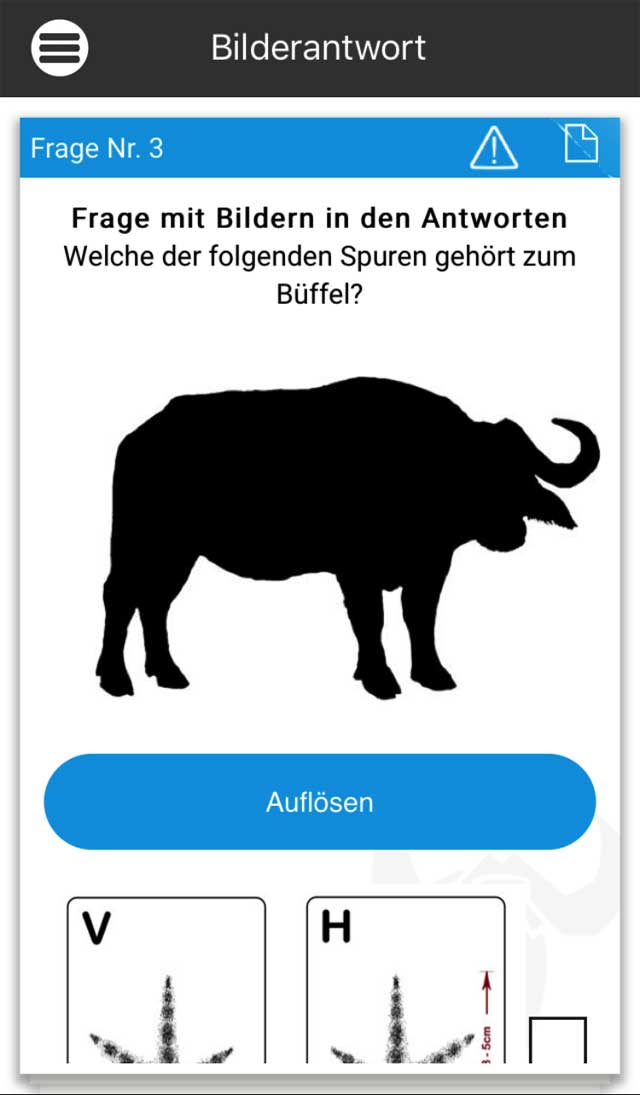 Bilderantworten sind zum Beispiel in dem Sachgebiet "Tierspuren & Fährten" (Büffeln One oder Jagdscheine App) zu finden.