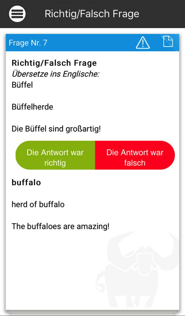 Richtig/Falsch-Fragen erfordern eigenes Handeln des Anwenders. Die Frage benötigt einen Freitext vom Anwender (vorher aufgeschrieben, oder gedacht) als Antwort. Anschließend kann die richtige Antwort aufgelöst werden und der Anwender bestimmt dann selbst, ob er richtig oder falsch lag.