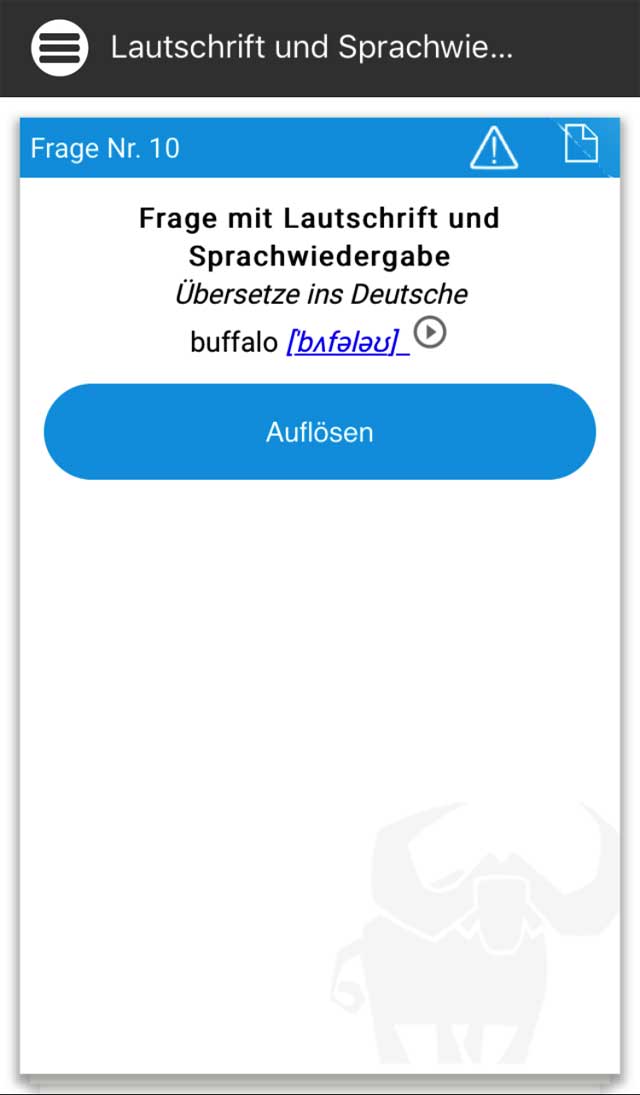 Fragen können auch mit einer Sprachwiedergabe hinterlegt werden. Hierbei wird die Lautschrift ausgelesen und mittels App wiedergegeben.